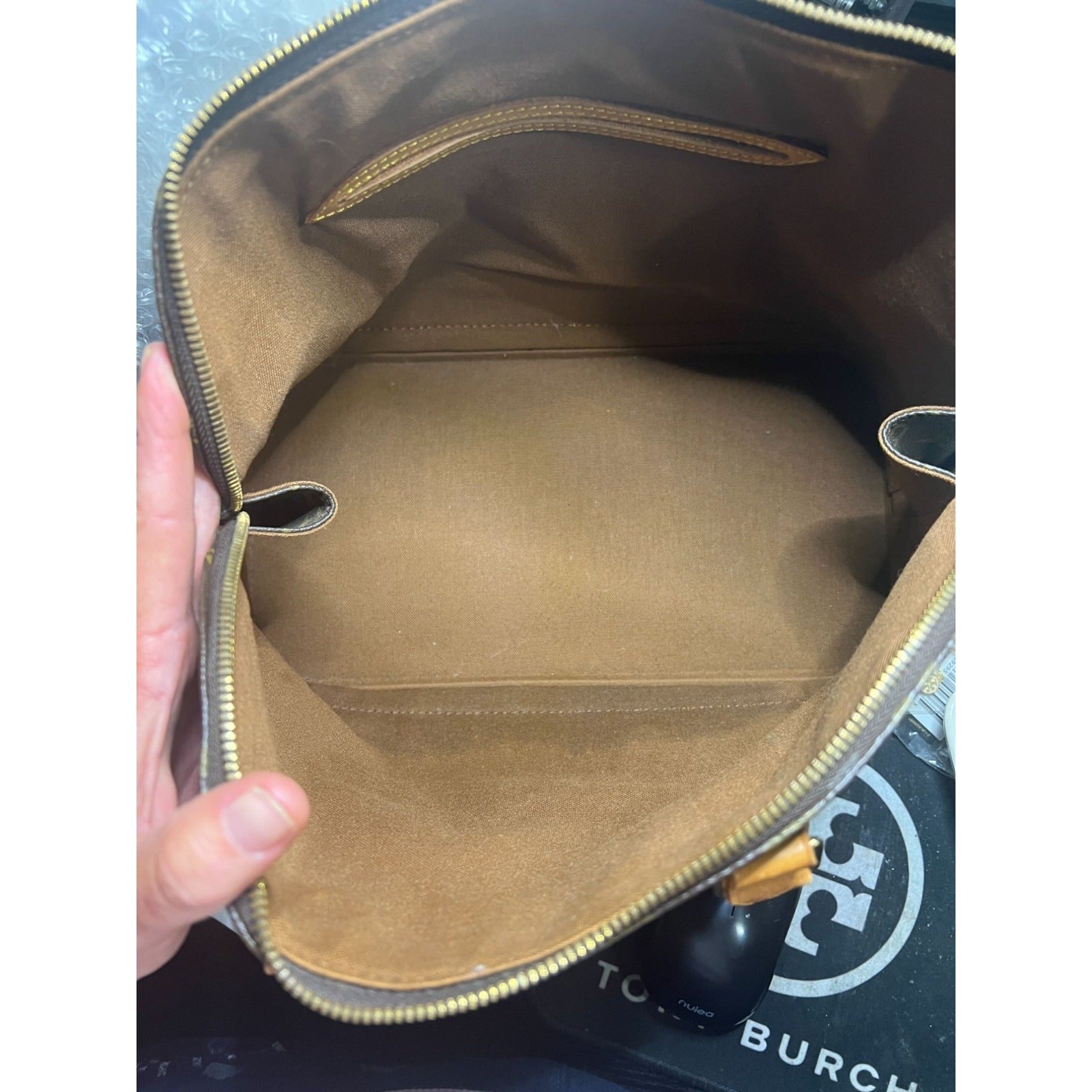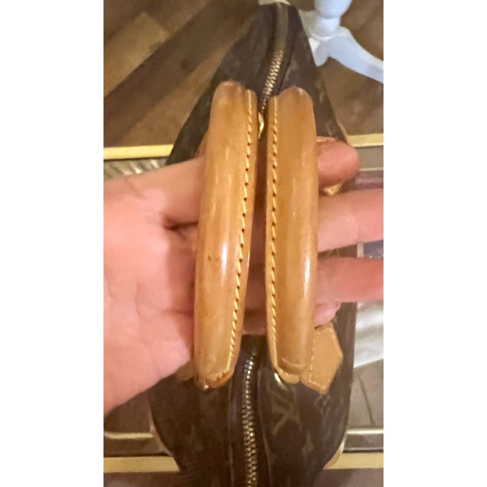 Good Condition! Mild Patena. The back side Handles are stained at the bottom of the leather handle parts and the bottom has an obvious wet stain. the top of the handles and zip portion are near perfect.
